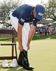 Le Canadien Corey Connors chausse ses magnifiques bottes de cowboy après avoir gagné le Valero Open à San Antonio.