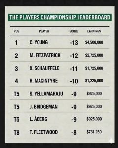originaire de la région de New York, a joué comme un dieu en fin de match pour enlever les honneurs du Championnat des joueurs au club TPC-Sawgrass, un coup devant l’Anglais MATT FITZPATRICK. Young a d’abord réussi son 3e birdie du wek-end au dangereux 17e trou, puis il a enchaîné avec un coup de départ de 375 verges pour obtenir une normale facile au 18e. C’est évidemment la plus grosse victoire de sa carrière et elle devrait le propulser vers de nouveaux sommets… Le grand perdant de la journée est le Suédois LUDVIG ABERG, auteur d’un malheureux 76. Il a expédié deux balles à l’eau sur deuxième neuf pour bousiller son avance et ouvrir la porte à ses adversaires. Semble-t-il qu’il faut perdre pour apprendre à gagner… Fitzpatrick et Justin
