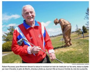Bobby Rousseau devant sa sculpture au club de golf Louiseville.