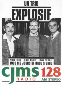 DÉCÈS DE PIERRE TRUDEL: Quelques jours avant Noël, j’apprends aussi la mort de Pierre Trudel, ex-étoile de la radio et de la télévision. Il souffrait de la maladie de Parkinson depuis plusieurs années. On le voit ici avec Michel Beaudry et Mario Tremblay à la belle époque de CJMS. Mes condoléances à sa famille.