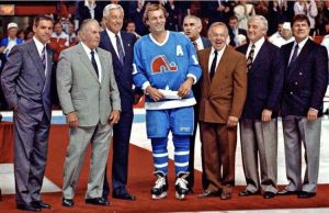 Guy Lafleur sur la patinoire du Forum avec le Rocket,  Réjean Houle, Jean Béliveau, Dollard St-Laurent, Yvan Cournoyer, Dickie Moore et Phil Goyette. Tous champions de la coupe Stanley.
