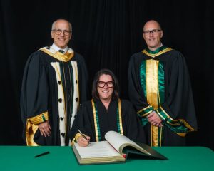 Danièle Sauvageau, récemment élue au Temple de la renommée du hockey, a été honorée par l’Université de Sherbrooke. Elle pose ici entre le recteur Pierre Cossette et Sylvain Turcotte, doyen de la Faculté des sciences de l’activité physique.