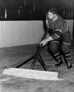 Elmer Lach passe la gratte sur la patinoire avant un exercice du CH, en 1947. Quel joueur ferait ça de nos jours?