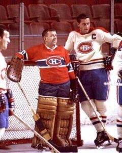 Gump Worsley a remporté 40 victoires dans les séries de championnat et il a aidé le CH à gagner 4 coupes Stanley. Il pose ici entre Claude Provost et le Gros Bill.