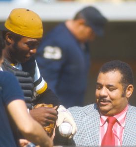Roy Campanella, ancien joueur étoile des Dodgers, en compagnie de Manny Sanguillen, des Pirates de Pittsburgh.