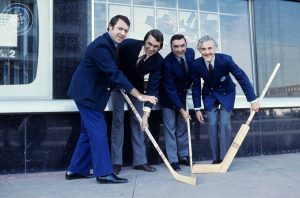 Gilles Tremblay, Richard Garneau, Lionel Duval et René Lecavalier, de «La Soirée du Hockey», en 1971.