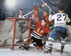 ALBUM SOUVENIR: Glenn Hall a été un des meilleurs gardiens de but dans l’histoire de la Ligue nationale. Ici, il se fait battre par Frank Mahovlich, jeune joueur des Maple Leafs.
