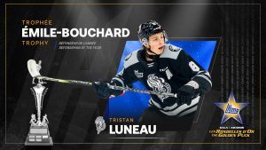 Tristan Luneau, des Olympiques de Gatineau, est récipiendaire du trophée Émile-Bouchard en tant que meilleur défenseur de la LHJMQ. Il a terminé le calendrier régulier avec 20 buts, 63 passes et un différentiel de «plus 49». Tristan a grandi à Victoriaville.
